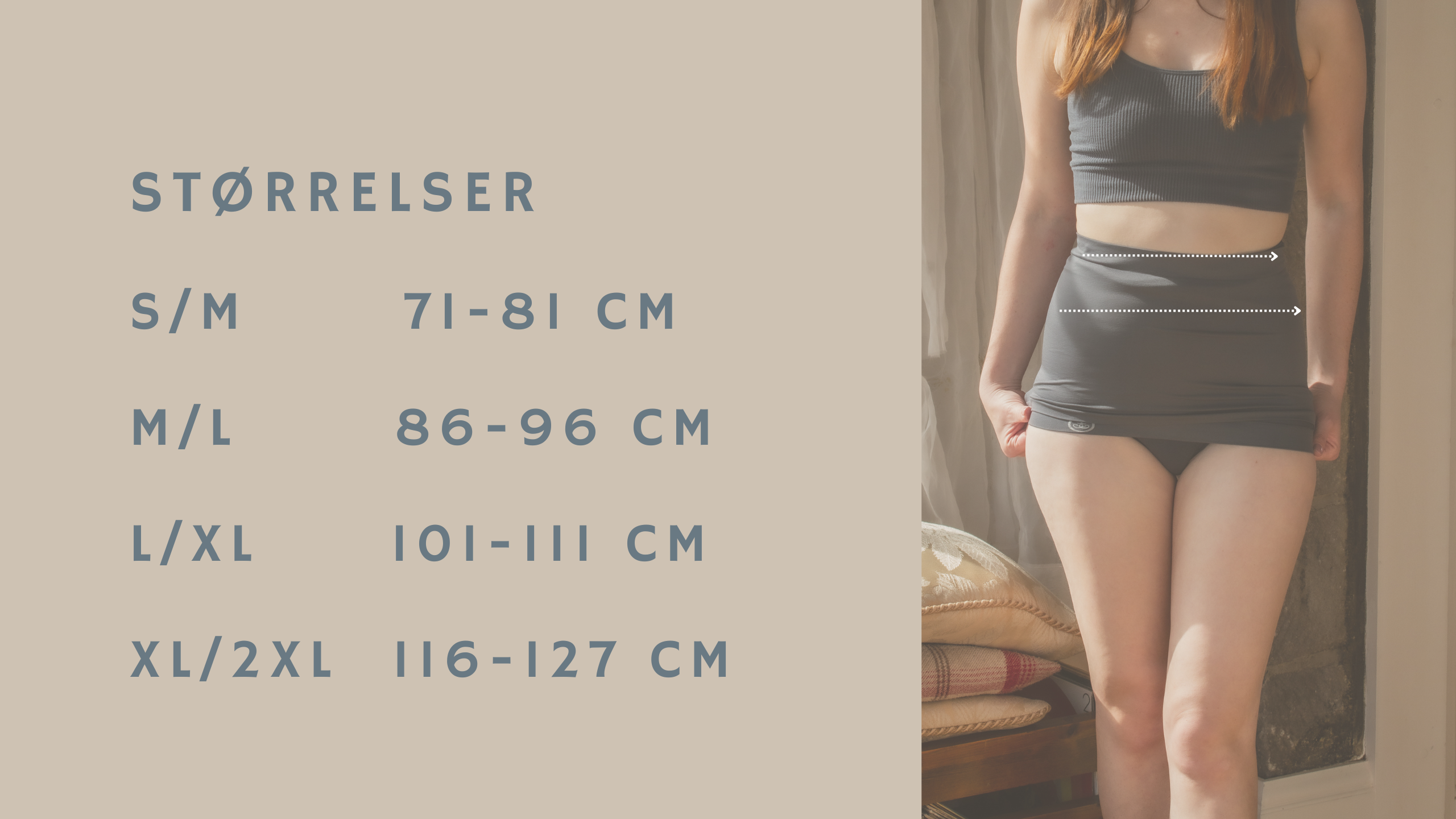 Alt du trenger for å finne riktig størrelse er et vanlig målbånd. Mål midjens smaleste punkt og mål over stomien. Ved et brokk skal målet tas liggende når brokket er helt avslappet.